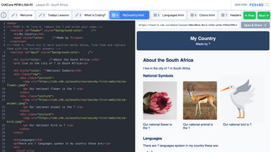 Not only do we teach real code, we interleave it with real world content and subjects such as history, mathematics, geography and biology. Students build websites on our country, famous women in history, the solar system, entrepreneurship and more.